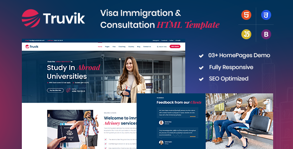 Truvik is an Iconic WordPress Theme that is specially design for visa consulting, immigration service provider, immigration lawyer, consultancy, migration agent, overseas jobs, coaching classes related websites.